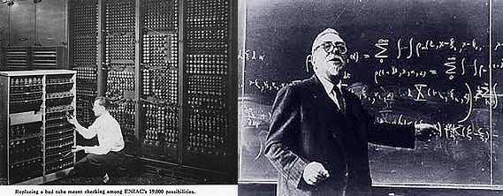 En 1945, l’ordinateur programmable marque l’entrée d’une nouvelle forme de pensée dans le monde. L’ENIAC, massif, pulsant, encombré de câbles et de relais, n’a rien de la légèreté des machines contemporaines ; il ressemble davantage à un organe encore maladroit, un cerveau minéral en gestation. (Photo ci-dessous) Et pourtant, de ce fracas électrique, quelque chose se détache pour la première fois de la main humaine. Le calcul, jusque-là inscrit dans le rythme du geste, dans le temps du papier et de l’esprit, devient une opération autonome, infiniment répétable, affranchie de la fatigue, du doute, de l’oubli.
